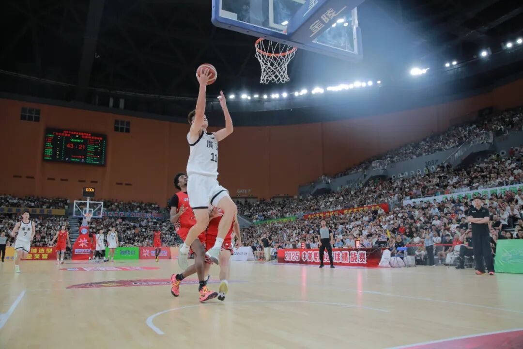 比赛开场便进入高潮,身着白色战袍的广东队率先掌控球权,33号贺希宁接球后迅速出手,一记干脆利落的三分球空心入网,为球队拿下本场首分。随后主队延续火热手感,连续三记进球稳稳命中,以8:0的完美开局奠定气势,最终凭借默契配合与高效进攻,以23:9的绝对优势结束第一节。